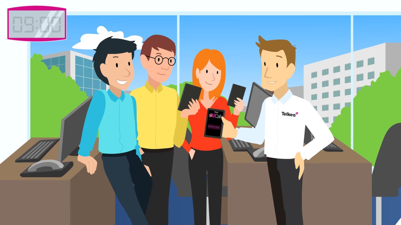 Pour cela, Toolearn a créé une animation vidéo de style motion design de moins de 2’. La vidéo décrit une journée type de Sam, nouvel utilisateur. Différentes mises en situation à différents moments de sa journée permettent d’illustrer les bénéfices de l’offre UCall. Un clip dynamique et convaincant !